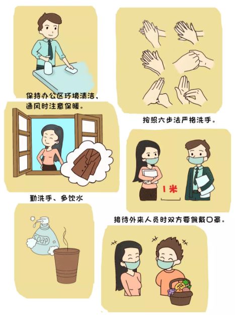 保持辦公區(qū)環(huán)境清潔,建議每日通風(fēng)3次,每次20-30分鐘,通風(fēng)時(shí)注意保暖。人與人之間保持1米以上距離,多人辦公時(shí)佩戴口罩。保持勤洗手、多飲水,堅(jiān)持在進(jìn)食前、如廁后按照六步法嚴(yán)格洗手。接待外來(lái)人員雙方佩戴口罩。