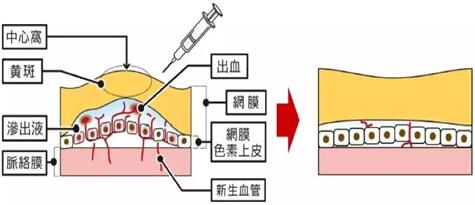 在視網(wǎng)膜黃斑區(qū)出現(xiàn)不該生長的「新生血管」,由于新生血管較脆弱且不健康,因此很容易導(dǎo)致破裂、出血。