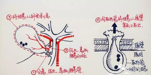 一起看圖。只說明一點,膽囊切除的過程,微創(chuàng)和開放手術(shù)完全一樣。區(qū)別在于微創(chuàng)的腹壁穿刺口小,我們會把膽囊放在取物袋里取出,有時因為結(jié)石過多過大,或膽囊水腫,會把標(biāo)本剪碎方便取出,但膽囊切除的時候確定是完整的,也不會有殘留。