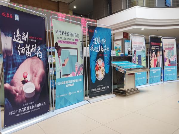 活動(dòng)現(xiàn)場(chǎng)布置主題橫幅,陳列抗微生物藥物合理使用宣傳海報(bào)。