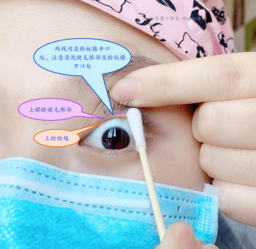 用嬰兒沐浴露或含有次氯酸、茶樹(shù)油等成分的眼部濕巾常規(guī)清潔瞼緣。