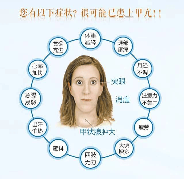 甲亢的主要表現(xiàn)有:容易情緒激動、煩躁失眠、心悸、乏力、怕熱、多汗、消瘦、食欲亢進、大便次數(shù)增多或腹瀉、女性月經(jīng)稀少。