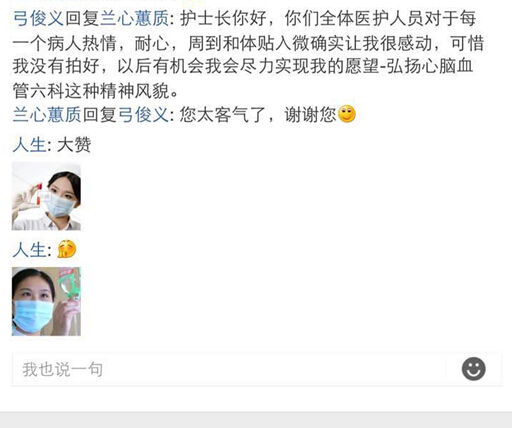 這些照片記錄了我們正給病人扎針時認(rèn)真的表情、給病人翻身時充滿愛的動作、跟病人交流時真誠的笑容……真是想不到我們在工作時是這么美!我仿佛從照片里看到我們每個人身后都有一雙隱形的翅膀,天使那柔和的光隱隱籠罩在四周。大叔給這組照片起名《白衣天使集》,還在下面說了一段話“延安大學(xué)咸陽醫(yī)院,在大西北對于心腦血管治療上很有名氣,是獨一無二的???,特別是六科給我的印象最深?!笨赐赀@些照片再看到這句話時,我的心里充滿了感動。都說“金杯銀杯不如病人的口碑”,這些照片和這段話是對我們辛勤勞動最大的肯定與鼓勵。護(hù)士長小小的一個舉動,為我們與患者之間搭起了一座橋,拉近了我們護(hù)患之間的關(guān)系,讓我們看到了我們工作的價值所在,也讓患者更加了解我們。