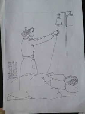 21床患者是位89歲的老太太,患有慢性阻塞性肺疾病,在科室住院已經(jīng)18天,在我們醫(yī)護人員的精心治療與照護下慢慢好轉(zhuǎn),這天終于可以出院回家了。辦理出院手續(xù)的當天上午,患者的兒子來到護士工作站,遞給辦公護士幾張勾畫過的白紙,待看清楚紙上的內(nèi)容后,她愣住了——原來那竟是幾幅精心描繪的人物畫像。畫的是誰?是給患者做輸液治療的護士、是給患者更換液體的護士、是幫助老人做霧化的護士、是在認真書寫護理記錄單的護士……簡潔又流暢的線條、樸素而生動的白描勾勒出護士們?nèi)粘Cβ档纳碛?,樸實又詳細的畫旁注解記錄了護士們平日點滴的工作。這是患者兒子在陪護的間隙用心記錄下來的,特意在患者出院時送給護士們留作紀念、表示感謝。