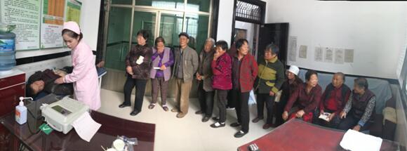 11月8日,義診進行到最后一天,方漢軍責任總醫(yī)師和劉曦護士長帶領科室主治醫(yī)師漆秦、護士魏楠,在當?shù)匦l(wèi)生院同仁的協(xié)助下,來到了渭城區(qū)正陽鎮(zhèn)韓家灣孫家村衛(wèi)生室。一進村,就看到衛(wèi)生室門口排起了長隊的鄉(xiāng)親們,他們期待的眼神頓時讓我們覺得責任重大。方醫(yī)生和漆醫(yī)生熱情的接待了村民,詳細詢問病史、細致的進行體格檢查,并針對個體差異為每位咨詢的村民提供科學的治療方案。同時,護士長劉曦為村民講解相關疾病知識,并不時的組織、維持現(xiàn)場秩序,測量生命體征。護士魏楠及時為患者進行心電圖檢查,并適時為結(jié)果異常的村民進行健康教育。