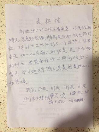 雖然不是第一次受到表?yè)P(yáng),雖然是幾句簡(jiǎn)短的話語(yǔ),但這封由兩個(gè)病室4位患者聯(lián)名送來(lái)的表?yè)P(yáng)信,著實(shí)讓劉欣護(hù)士倍感激動(dòng)。當(dāng)她接過(guò)家屬手里表?yè)P(yáng)信時(shí),不停地說(shuō):“這是我應(yīng)該做的,你們太客氣了。”
