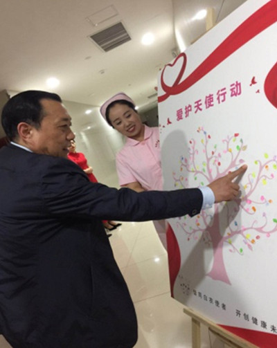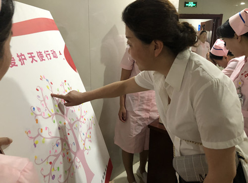啟動儀式以共建愛心樹拉開帷幕,與會人員在愛心樹上用手印簽到,留下神圣的印記,代表著護理團隊的欣欣向榮與蓬勃發(fā)展。首先由李衛(wèi)軍董事長為大會致辭,他表示愛護天使行動項目能落戶我院是我們的榮幸與驕傲。在我們喜迎建院70周年之際,“愛護天使行動—臨床護理人員心理關(guān)懷項目”在我院落地開花。希望通過此項目的實施,能夠提高護士的幸福感知力,培養(yǎng)護士積極向上的心態(tài),幫助護士認識到健康職業(yè)心理的重要性,以提高醫(yī)療服務(wù)效率及滿意度,為“健康中國”貢獻力量。