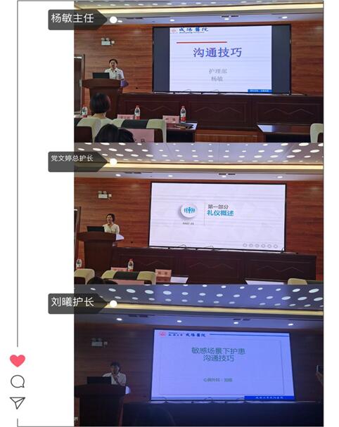 楊敏主任,黨文婷總護(hù)士長,劉曦護(hù)士長深入淺出的講解了溝通及職業(yè)禮儀的重要性,內(nèi)容新穎、主題鮮明、貫穿的思想深刻而長遠(yuǎn),開拓了護(hù)理服務(wù)新思維,讓大家感受到了溝通的魅力。