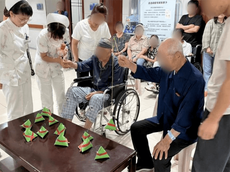 活動(dòng)第二項(xiàng)釣粽子比賽:該項(xiàng)游戲,不僅可以鍛煉患者上肢力量、控制能力,更能幫助患者練習(xí)定向力和注意力。他們每個(gè)人認(rèn)真努力,無論輸贏都是對自己的一份肯定和鼓舞!他們不放棄的精神獲得了在場所有人的陣陣掌聲。醫(yī)護(hù)人員也為參與游戲的患者準(zhǔn)備了“健康平安包”,這些香包蘊(yùn)含了艾草的香氣,可以驅(qū)除疲勞、改善睡眠,為患者帶去呵護(hù)和祝福。