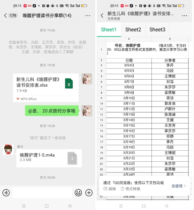 "腹有詩書氣自華,最是書香能致遠”,讀書可以明理、啟智、養(yǎng)德。為積極響應護理服務行動計劃,進一步根深人文護理理念,提高護理隊伍人文素養(yǎng),細化人文關懷措施,為患者提供人性化護理服務。兒科二病區(qū)護士長盧群葉組織大家開展“同讀書,共進步”活動。大家集思廣益制定了共讀方案及讀書實施表,護士每天輪流閱讀,于當日20:00以錄音文件形式發(fā)至微信群內(nèi),大家利用碎片化時間接龍分享聽書心得。