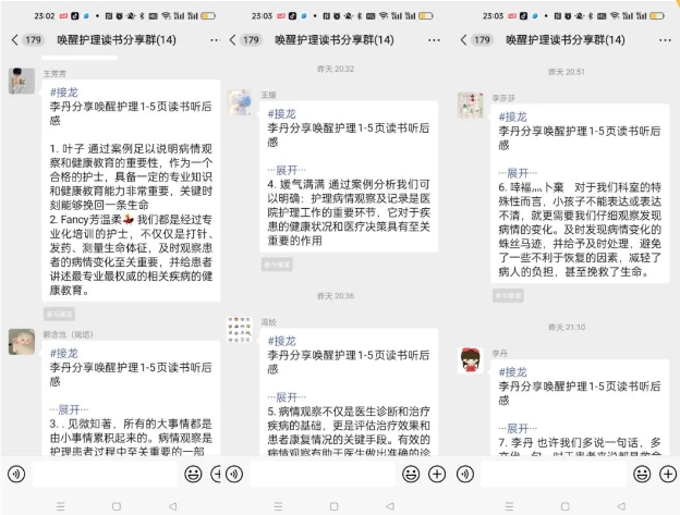 第一天讀書分享后,我主動帶頭將聽書后感想發(fā)至群內(nèi),護士姐妹們熱情高漲,讀書聽書積極性很高,分別接龍分享了自己聽書后的感想,丹丹護士表達“自己讀一遍還是感覺不太一樣的,一下子就領會了病情觀察和健康指導的重要性”。芳芳護士分享“我們都是經(jīng)過專業(yè)化培訓的護士,不僅僅是打針、發(fā)藥、測量生命體征,及時觀察患者的病情變化至關重要,并給患者講述最專業(yè)最權威的相關疾病的健康教育......”大家分別分享著自己的心得體會,沉浸在讀書的氛圍中……