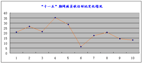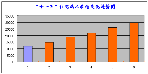 說明:“十一五”末較“十五”末住院病人收治增加1.51倍;年平均增長速度為30.19%;日均在院病人“十一五”末為937人,較“十五”末平加了1.29倍;完成了醫(yī)院規(guī)模經(jīng)營階段性目標。