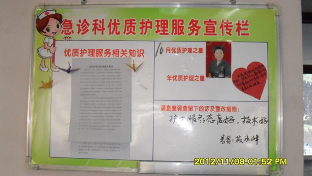 優(yōu)質(zhì)護理服務是衛(wèi)生部2010年在全國范圍內(nèi)開展的“優(yōu)質(zhì)護理服務示范工程”活動。我院結合全國衛(wèi)生系統(tǒng)創(chuàng)先爭優(yōu)活動和“服務好、質(zhì)量好、醫(yī)德好,群眾滿意”的“三好一滿意”活動,深化“以病人為中心”的服務理念,緊緊圍繞“改革護理模式,履行護理職責,提供優(yōu)質(zhì)服務,提高護理水平”的工作宗旨,充分認識到推廣優(yōu)質(zhì)護理服務是公立醫(yī)院改革的重要內(nèi)容,是保障醫(yī)療安全,促進醫(yī)患和諧的必然要求,調(diào)動臨床一線廣大護士工作的積極性,認真貫徹執(zhí)行《衛(wèi)生部關于加強醫(yī)院臨床護理工作的通知》、《綜合醫(yī)院分級護理指導原則(試行)》、《住院患者基礎護理服務項目(試行)》、《基礎護理服務工作規(guī)范》和《常用臨床護理技術服務規(guī)范》的要求,改革護理工作模式,病房實施責任制分工方式,每名責任護士均負責一定數(shù)量的患者,整合基礎護理、病情觀察、治療、溝通和健康指導等護理工作,為患者提供全面、全程、連續(xù)的護理服務。全面落實護理職責,協(xié)助醫(yī)師實施診療計劃,密切觀察患者病情,及時與醫(yī)師溝通,隨時與患者溝通,對患者開展健康教育,康復指導,提供心理護理。我院自2010年開展優(yōu)質(zhì)護理服務工作,從2個試點病區(qū)開始,2011年擴大到21個病區(qū),至2012年4月份,30個病區(qū)全部開展優(yōu)質(zhì)護理服務工作,開展率100%。今年,急診科、手術室結合本專業(yè)特點,也開始開展優(yōu)質(zhì)護理服務工作。急診科優(yōu)化工作流程,結合??铺攸c,落實“一站式服務”,開放綠色通道;加強理論知識學習和技能訓練,打造一支具有良好的心理素質(zhì),出診迅速,扎實的理論知識和熟練的操作技能,優(yōu)良的護理服務,及時挽救患者生命的高質(zhì)量的急救團隊。手術室通過優(yōu)質(zhì)護理服務,加強與患者的溝通交流,術前訪視介紹手術方法,使患者了解手術中應注意配合的,緩解患者在手術期間的恐怖心理,取得信任,以最佳的心理狀態(tài),迎接手術;手術中在規(guī)范化護理配合同時,提供溫馨服務,“手拉手”一個細小的動作,消除恐懼、緩解憂傷和孤獨情緒。制作保暖套,預防壓瘡,保護隱私,出手術間時,擦凈消毒漬和殘留血跡,消除不良刺激,保護患者尊嚴與麻醉師護送病人回病房,交代注意事項;術后回訪,了解手術并發(fā)癥情況,調(diào)查工作滿意情況,制定整改措施,使患者安全度過手術期。
