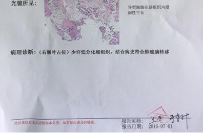術(shù)后冰凍切片報告考慮轉(zhuǎn)移瘤,我院石蠟病理結(jié)果為少許低分化癌組織,結(jié)合病史符合肺癌腦轉(zhuǎn)移。