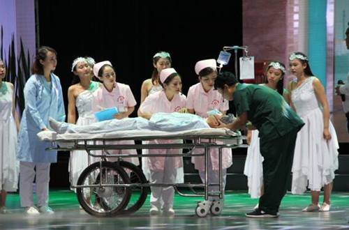 情景劇《守望》是根據(jù)在我院發(fā)生的真實故事改編而成,講述的是13名醫(yī)護人員經(jīng)過6個小時的分秒必爭,終于將一名70多歲的老人從死亡線上拉回來的故事,老人在昏迷之際隱約聽到家屬與醫(yī)護之間的交流,醒來的第一件事竟是在紙上寫下了“護士沒吃飯”五個字。事情發(fā)生后,全國各大媒體爭相報道,事跡感動了億萬人。節(jié)目通過朗誦與情景相結合的藝術表現(xiàn)形式,演繹醫(yī)患關系漸漸回歸到人性的本真。我院愛心藝術團精彩的表演引起了臺下觀眾的強烈共鳴,感動了在場的千余名觀眾,掌聲經(jīng)久不息。