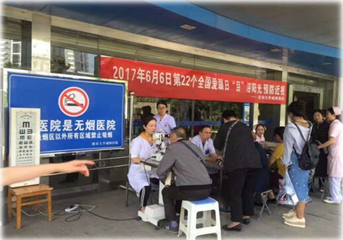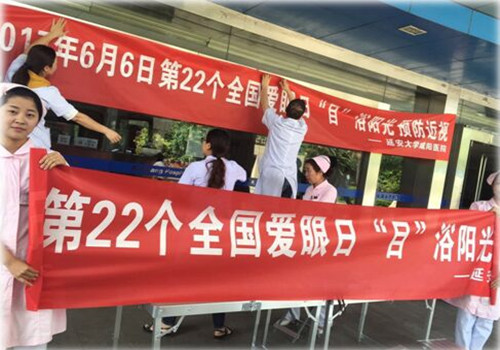 在第22個全國愛眼日到來之際,延安大學咸陽醫(yī)院眼科在社區(qū)服務科協(xié)助下,2017年6月6日在延安大學咸陽醫(yī)院門診樓前舉辦了以“‘目’浴陽光,預防近視:保護視力,追求光明”為主題的大型愛心義診活動。