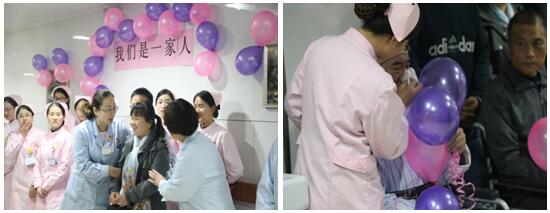 首先,播放勵志短片《康復(fù)給你生命的質(zhì)量》,短片講述了偏癱患者住院康復(fù)期間,在醫(yī)護人員鼓勵、家人關(guān)懷和愛護下,回歸家庭的經(jīng)歷。短片播放時,在場的所有人員都雙眼含淚。隨著“我喜歡一回家,就有暖洋洋的燈光在等待;我喜歡一起床,就看到大家微笑的臉龐;我喜歡一出門,就為了家人和自己的理想打拼;我喜歡一家人,心朝著同一個方向眺望 哦......”音樂響起,全科醫(yī)護人員面帶微笑跟隨音樂翩翩起舞,用歌聲把自己的愛和歡笑帶給大家。隨后所有醫(yī)護人員在胡亞妮副主任帶領(lǐng)下進行了自我介紹并給患者送出祝福語;同時將自己手中的小氣球送給本階段康復(fù)很棒的患者及家屬并相互鼓勵。接過氣球的瞬間,許多患者及醫(yī)護人員當(dāng)場落淚。張亞靜護士長邀請家屬代表發(fā)言,講述了偏癱患者目前的家庭狀況及在我院治療后的情況,表達了對吳引萍、劉楠醫(yī)生等全體醫(yī)護人員的感謝。心理治療師祁麗麗講述患者、家屬及醫(yī)護人員之間彼此信任、相互鼓勵才能共同進步,并且提議大家相互擁抱,相互肯定,相互鼓勵。在場的人員相互擁抱、熱淚盈眶。此時此刻我們知道,這是信任,是感謝,是對我們醫(yī)護人員工作的肯定,更是對家人的一種由衷的認可與愛。