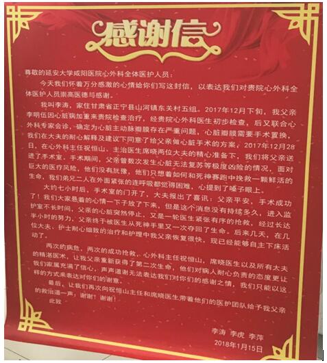 從臥床不起到床邊活動、從病房到室外,李某狀態(tài)也一天好于一天,2018年1月15日,李某康復(fù)出院,脫下病員服,精神而帥氣。他和他的兒女拿著感謝信來到我們辦公室,還特意告訴我們:“這代表著我們的一片謝意!”。看著紅彤彤的感謝信,而我們只能說:“謝謝你對我們的信任”。是的,患者對醫(yī)務(wù)人員的信任,是戰(zhàn)勝病魔的強大動力。
