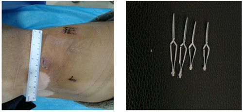 如圖一圖二為腫瘤位置及大小,圖三即為手術(shù)操作通道(5mm、10mm、12mm),術(shù)中游離出腎動(dòng)脈后,用圖四的血管夾臨時(shí)阻斷腎臟血液供應(yīng),剜除腫瘤后,在腔鏡下縫合腎臟,確定縫合嚴(yán)密,再恢復(fù)腎臟血供!要求阻斷時(shí)間不能超過(guò)30分鐘,此例患者阻斷17分鐘!此類手術(shù)技術(shù)難度大,腹腔鏡下縫合要求高,并對(duì)血供阻斷有時(shí)間要求!