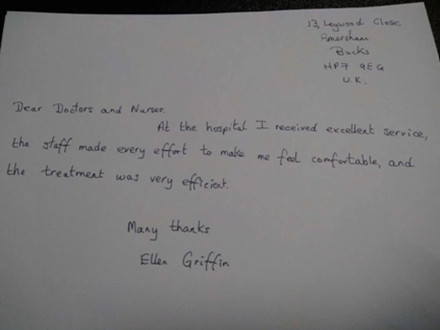 經(jīng)過(guò)一番細(xì)致診療與照護(hù),Ellen Griffin病情明顯改善,下午六時(shí)許,老人經(jīng)過(guò)治療后,恢復(fù)的非常好,由于行程的安排,他們要轉(zhuǎn)機(jī)去北京,醫(yī)院的專家組經(jīng)慎重評(píng)估后認(rèn)為可以轉(zhuǎn)機(jī),但囑咐她們要注意休息,勞逸結(jié)合,及時(shí)復(fù)診,老人和他的丈夫非常感謝我們,臨走時(shí)還給我們寫了一段感謝的話:Dear doctors and nurses,At the hospitail ,I receivd excellent service,the staff made every effort to make me feel comfortable ,and the treatment was very efficient(謝謝,非常感謝你們延安大學(xué)咸陽(yáng)醫(yī)院的及時(shí)救治,我現(xiàn)在感覺(jué)好多了。你們的服務(wù)讓我感到非常滿意,你們的醫(yī)術(shù)非常棒!謝謝?。?,遞給了內(nèi)科病院綜合辦王夢(mèng)嬌主管,王夢(mèng)嬌主管看到這一段話后感到非常的激動(dòng),她說(shuō):“其實(shí)我們也沒(méi)做什么,我們只做了我們應(yīng)該做的!”。最后在場(chǎng)的醫(yī)護(hù)人員應(yīng)老人一家的邀請(qǐng)一起進(jìn)行了合影留念,老人在一片歡笑聲中離開(kāi)了醫(yī)院,繼續(xù)她的中國(guó)之旅的下一站—北京之行。