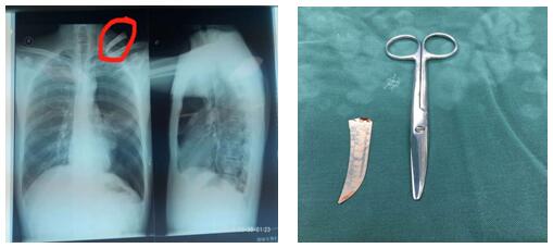 患者左頸根部可見一長(zhǎng)約2cm傷口,邊緣整齊,內(nèi)插入刀片斷端出血不止。左頸根部刀刺傷常常會(huì)損傷頸胸部大血管導(dǎo)致大出血危及生命、同時(shí)會(huì)造成開放性氣胸危及生命,病情非常危急,需行急診開胸探查術(shù)。苗主任與李偉主治醫(yī)師、李仁栓主治醫(yī)師立即制定了手術(shù)方案。1:40分患者被送進(jìn)手術(shù)室,在全麻下行胸腔鏡探查楔形切除、肋間血管縫合,胸壁傷口清創(chuàng)術(shù)。手術(shù)緊張有序地進(jìn)行。凌晨4點(diǎn)鐘患者安全返回病房,手術(shù)順利完成。從患者頸部取出的刀片長(zhǎng)約10cm 左右。