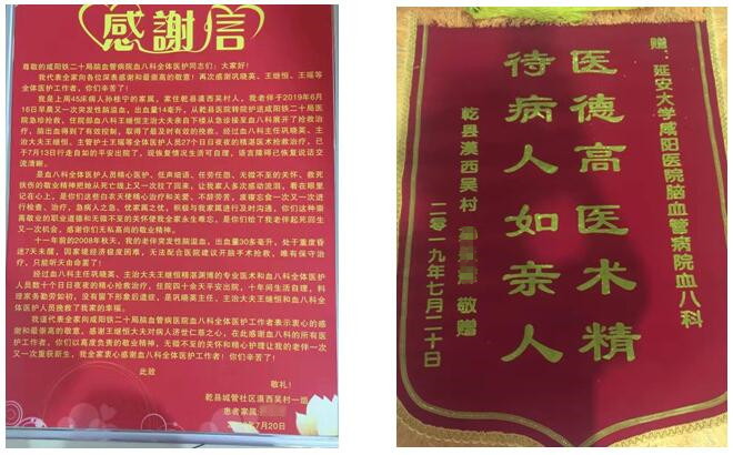 此時,外面?zhèn)鱽砹松跎俾牭降年囮囌坡暸c歡笑聲,原來是我們已經(jīng)康復(fù)出院的老病人攜帶她的女兒、老伴、孫子,懷里抱著的、手里提著的,肩上舉著的是一面面錦旗,一封封感謝信,仿佛是在竭盡所有來向我們表示他們真誠的感謝。十一年前這位病人因?yàn)槟X出血入住我科,經(jīng)過全力治療后康復(fù)出院,十一年后再發(fā)腦出血,入院后,鞏小英主任及王繼恒主管醫(yī)生高度重視,制定了詳盡合理的診治方案。.......與此同時,醫(yī)護(hù)人員間細(xì)心的溝通,以優(yōu)質(zhì)的服務(wù)讓患者及家屬樹立了戰(zhàn)勝疾病的信心,該患者的康復(fù)出院給了我們工作上莫大的肯定,讓我們在工作上有了更大的干勁!