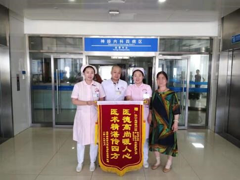 2019年7月23日,神經(jīng)內(nèi)科四病區(qū)的醫(yī)護(hù)人員像往日一樣緊張有序的忙碌著,突然一面繡有“醫(yī)德高尚暖人心,醫(yī)術(shù)精湛傳四方”字樣的錦旗映入了眼簾,送錦旗的是今日出院患者薛先生的家屬。她滿懷欣喜地特意將錦旗送到病區(qū),感謝全體醫(yī)護(hù)人員在他先生住院期間的精心治療和熱情服務(wù)。