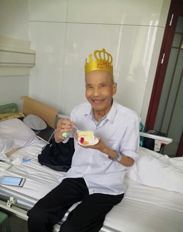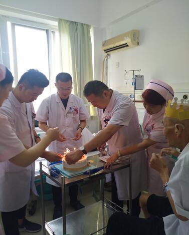 2019年8月22日上午,放療科的病房里其樂融融。“祝你生日快樂!祝你生日快樂……” 伴隨著歡快的歌聲,尹信主任帶領(lǐng)科室人員端著生日蛋糕來到趙大爺床前?!按鬆?,祝您生日快樂!壽比南山!早日健康!”。 老人愣了一下,繼而開心不已,笑的像個(gè)孩子:“來醫(yī)院看個(gè)病,還給過生日……嘿嘿……”