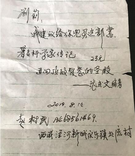趙大爺退休之前是一名優(yōu)秀的教師。住院期間,在和護(hù)士長溝通交流的過程中,得知護(hù)士長的孩子在上高中,便記在了心里,一天早上查房時(shí),他鄭重其事地將一張推薦購買優(yōu)秀書籍的紙條遞到護(hù)士長的手里,自己病魔纏身,還替別人操這份心,護(hù)士長劉莉很感動。