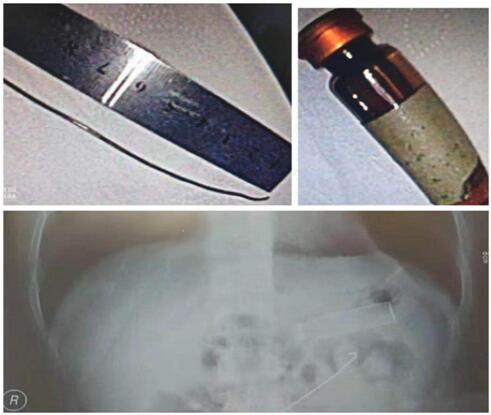 2019年10月22日,消化內(nèi)科一病區(qū)科主任李恒副主任醫(yī)師接診了一位特殊病患,經(jīng)詳細(xì)詢問相關(guān)病史,患者曾于近日不慎將一藥瓶及鋼絲吞下,反復(fù)腹痛,但尚可耐受。晨起患者突感腹痛劇烈,急診行腹平片示:類似藥瓶樣異物潴留于胃中,而類似鋼絲樣異物已嵌頓至小腸近端。李恒副主任醫(yī)師當(dāng)機(jī)立斷,憑借多年臨床經(jīng)驗(yàn)及精湛的內(nèi)鏡操作診療技術(shù),認(rèn)為首選內(nèi)鏡下異物取出術(shù),創(chuàng)傷較小,但因?yàn)殇摻z樣異物嵌頓于小腸近端,位置較遠(yuǎn),而且存在嵌入深度不明確,并發(fā)消化道出血、穿孔等風(fēng)險(xiǎn)較大,胃鏡長度不足等棘手問題。與患者進(jìn)行了詳細(xì)的溝通,充分告知內(nèi)鏡下取異物的優(yōu)點(diǎn)及與之面臨的難度及風(fēng)險(xiǎn)。內(nèi)鏡下異物取出術(shù),能明顯減輕痛苦,降低醫(yī)療費(fèi)用,同時(shí)避免了手術(shù)風(fēng)險(xiǎn)及術(shù)后并發(fā)癥等一系列問題。最終,在征得患者本人同意后,立即通知內(nèi)鏡中心,準(zhǔn)備急診無痛胃鏡探查。