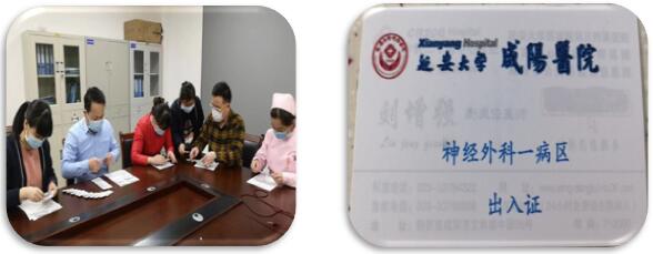 (3)為方便患者及家屬,在劉增強主任、趙茹護士長帶領下,科室人員利用下班時間制作了病區(qū)出入證,所有家屬憑出入證進出病區(qū),并開啟門禁系統(tǒng),減少閑雜人員出入。住院期間,根據(jù)患者情況留陪人數(shù)。疫情非常時期,為保證所有患者的安全和康復后更好的相聚,請做好親屬解釋工作,禁止探視。