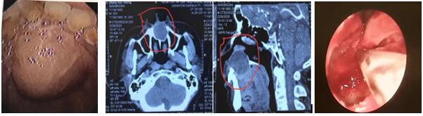 患者,男,59歲,因“發(fā)現(xiàn)口腔內(nèi)腫物3月”入院,腫物累及鼻底,并導(dǎo)致鼻底嚴(yán)重隆起,經(jīng)上頜骨CT三維重建檢查,腫物大,且口內(nèi)粘膜因腫物壓迫已很菲薄,還合并腎病綜合癥,口服激素一年余。住院后張立剛主任組織術(shù)前討論,認(rèn)為患者如行傳統(tǒng)經(jīng)唇齦切口手術(shù)方式,極易導(dǎo)致傷口感染或不愈合,引起囗腔鼻腔漏,給患者帶來(lái)災(zāi)難性后果。經(jīng)查閱文獻(xiàn),結(jié)合自身堅(jiān)實(shí)的鼻內(nèi)鏡技術(shù)基礎(chǔ),決定行經(jīng)鼻內(nèi)鏡鼻底上頜骨囊腫摘除術(shù)。手術(shù)取鼻底小切口入路,切開(kāi)黏膜后即見(jiàn)大量粘液溢出,清理后見(jiàn)口腔面黏膜菲薄,透光,與術(shù)前評(píng)估一致,遂將囊腫切除,等離子徹底止血,為防止壓迫導(dǎo)致口腔鼻腔漏形成,摒棄傳統(tǒng)的碘仿紗條壓迫兩周的觀念,術(shù)腔僅填塞可吸收明膠海棉,避免因填塞導(dǎo)致術(shù)后劇烈頭痛等不適。術(shù)后檢查見(jiàn)鼻腔結(jié)構(gòu)完整,口內(nèi)包塊明顯縮小,鼻面部無(wú)任何不適。