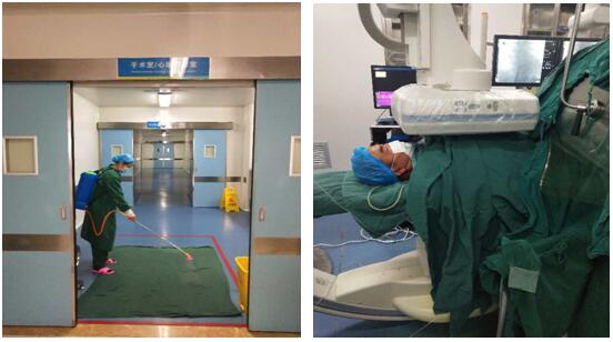 全科醫(yī)護(hù)人員在完成日常介入手術(shù)配合之外,在做好患者及工作人員自身防護(hù)的基礎(chǔ)上,為確保特殊時(shí)期醫(yī)患更加安全,我們遵循預(yù)防新型冠狀病毒的最新指南,嚴(yán)格執(zhí)行手術(shù)規(guī)范。全科人員每日提前半小時(shí)到崗,對(duì)非限制區(qū)、限制區(qū)域及病員通道清潔、消毒3次;術(shù)前詳細(xì)詢問患者及陪人有無新型冠狀病毒接觸史、發(fā)熱史;手術(shù)過程中層流系統(tǒng)不間斷、每臺(tái)手術(shù)后手術(shù)間徹底清潔消毒、全天手術(shù)結(jié)束后全體人員對(duì)科室所有區(qū)域再次進(jìn)行徹底清潔消毒,確保第二天手術(shù)的順利進(jìn)行。