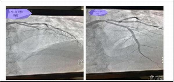 15分鐘后,患者王先生在家屬的陪同下來(lái)到了延安大學(xué)咸陽(yáng)醫(yī)院心血管病院11樓心六科,在吳醫(yī)生問(wèn)診及查體時(shí)患者胸痛再次發(fā)作,并于4點(diǎn)20分突然出現(xiàn)四肢抽搐、呼之不應(yīng),觸摸頸動(dòng)脈搏動(dòng)消失,呼吸呈嘆息樣,立即予以心肺復(fù)蘇術(shù),心電監(jiān)測(cè)提示心室停搏,與此同時(shí)我科楊登魁責(zé)任總醫(yī)師、我院心一科王銀濤醫(yī)師、心二科代雪茹醫(yī)師、心三科王巖醫(yī)師、留夜護(hù)士陳娜、心七科徐云鵬醫(yī)師、留夜護(hù)士高謙聞?dòng)嵹s來(lái),并立即投入緊張的搶救過(guò)程中,經(jīng)予持續(xù)胸外按壓、多次電除顫等治療后患者于4點(diǎn)40分意識(shí)逐漸恢復(fù),心電監(jiān)測(cè)示加速性室性自主心律,搶救成功,而早己就位的導(dǎo)管室同仁也做好了準(zhǔn)備工作,并于6點(diǎn)40分成功開通了患者閉塞血管,術(shù)后患者生命體征平穩(wěn)。