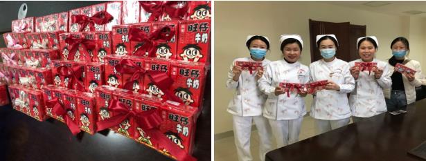 “午休之際,接到通知在示教室集合”我們迅速穿戴整齊,都以為是要開(kāi)會(huì)學(xué)習(xí)。但推開(kāi)門(mén)映入眼簾的,居然是一排排最?lèi)?ài)的“旺仔牛奶”,喜慶的旺旺上貼著精美的純手工蝴蝶結(jié),令大家雀躍不已,仿佛回到了無(wú)憂無(wú)慮的童年。護(hù)士王娟說(shuō)到:太感動(dòng)了,護(hù)士長(zhǎng)總能給人出乎意料的驚喜。實(shí)習(xí)生也說(shuō)到,心三科給了他們更多的教導(dǎo)和感動(dòng)……護(hù)士長(zhǎng)說(shuō)道:禮物雖小,寓意重大,2020年即將過(guò)去,希望大家來(lái)年在生活上、工作上,平安喜樂(lè),永遠(yuǎn)童心未泯、永遠(yuǎn)旺旺旺!
