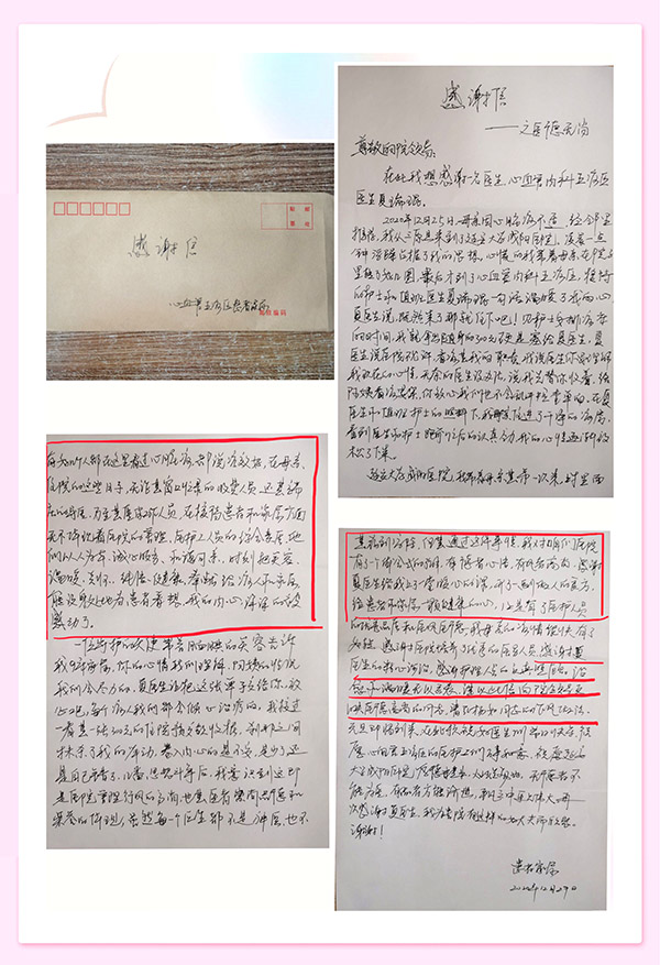 簡(jiǎn)簡(jiǎn)單單的一封信,對(duì)我們科全體醫(yī)護(hù)人員來(lái)說(shuō),是一份有份量有溫度的肯定。這不僅僅是患者對(duì)我們的感謝、贊許與信任,更是對(duì)每一位醫(yī)務(wù)人員一點(diǎn)一滴付出的認(rèn)可,同時(shí)也是一種鞭策。我們將繼續(xù)努力,爭(zhēng)取讓每一位患者放心,讓每一位家屬信任。解病人之痛苦,緩家屬之擔(dān)憂。