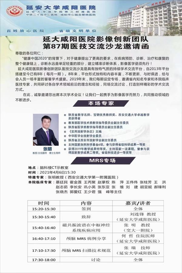 2021年4月6日,延安大學(xué)咸陽醫(yī)院第87期醫(yī)技交流活動在腦科樓CT/MRI示教室成功舉辦,延安大學(xué)咸陽醫(yī)院院長助理兼醫(yī)學(xué)影像科主任劉連鋒教授主持,特邀西安交通大學(xué)第一附屬醫(yī)院張明教授及其團隊、215醫(yī)院張華文主任團隊、咸陽市中心醫(yī)院白云主任、神經(jīng)內(nèi)科六病區(qū)趙志茹主任、我院老年病區(qū)霍金蓮主任、神經(jīng)內(nèi)科十病區(qū)張東亞主任及神經(jīng)內(nèi)科VIP二病區(qū)王少君主任等臨床與醫(yī)技醫(yī)師參加本次活動。我院影像及臨床醫(yī)、技、護共60余人參加了本次會議。