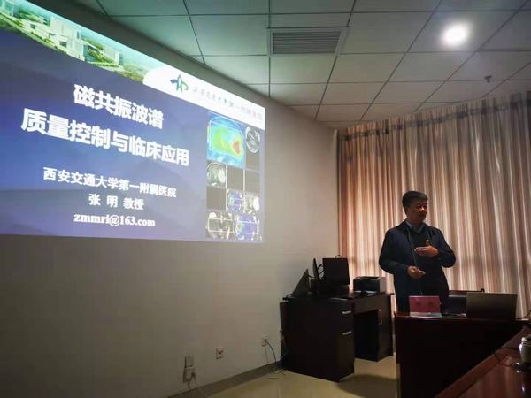 下午3點30分,會議正式開始,經(jīng)過劉連鋒主任隆重介紹后,西安交通大學(xué)第一附屬醫(yī)院張明教授進行了會前致辭,張教授表示,每次來到咸陽總是懷揣著深厚的情感,看到我院及我科室不斷發(fā)展前進他感到十分的欣慰,同時對我科室工作人員給予勸勉,強調(diào)要做好病例的追蹤隨訪,不斷提高診斷水平,加強業(yè)務(wù)能力。隨后,張明對《磁共振波譜在中樞神經(jīng)系統(tǒng)疾病應(yīng)用》進行講授,從MRS臨床應(yīng)用、存在問題、質(zhì)量控制及質(zhì)量控制的應(yīng)用效果診斷思路四個方面進行了標(biāo)準(zhǔn)與規(guī)范化的指導(dǎo),對于MRS常見疾病及鑒別診斷通過病例展示向大家進行了精彩詳細的講解,內(nèi)容豐富,積極調(diào)動了在場聽眾的學(xué)習(xí)興趣。張教授指出,MRS掃描定位技術(shù)、序列的選擇、譜線的質(zhì)量都是影像我們對疾病診斷的因素,因此建立MMRS規(guī)范化掃描流程是做好MRS質(zhì)控工作的關(guān)鍵。本次授課讓與會臨床及醫(yī)技人員對磁共振波譜原理及應(yīng)用有了清晰與深刻的認(rèn)識,對我院MRS掃描及疾病診斷水平有顯著提高。
