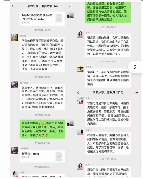 生活中人與人之間最少不了的便是溝通,為了讓溝通不再是生活及工作中的矛盾,神經(jīng)內(nèi)科六病區(qū)張文靜護士長在護理部的推薦下特意將《非暴力溝通》這本書帶給我們。下班后,我們利用自己的閑余時間,伴著悠揚的輕音樂,細細的品味及探討。
