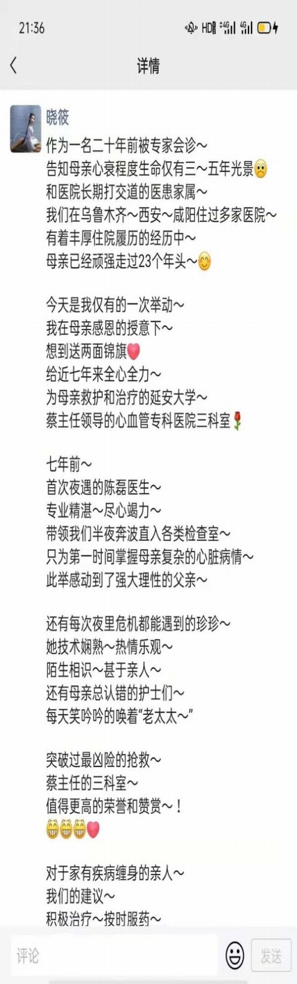 “作為一名二十年前被專家會(huì)診,告知母親心衰程度生命僅有三到五年光景,和醫(yī)院長(zhǎng)期打交道的醫(yī)患家屬,我們?cè)跒豸斈君R、西安、咸陽(yáng)住過(guò)多家醫(yī)院,有著豐厚住院履歷的經(jīng)歷中,母親已經(jīng)頑強(qiáng)的走過(guò)了23個(gè)年頭。今天是我僅有的一次舉動(dòng),我在母親感恩的授意下,想到送兩面錦旗,給近七年來(lái)全心全力、為母親救護(hù)和治療的延安大學(xué)咸陽(yáng)醫(yī)院——蔡萍主任領(lǐng)導(dǎo)的心血管內(nèi)科三病區(qū)科室。七年前,首次夜遇的陳磊醫(yī)生,專業(yè)精湛、盡心竭力,帶領(lǐng)我們半夜奔波直入各個(gè)檢查室,只為第一時(shí)間掌握母親復(fù)雜的心臟病情,此舉感動(dòng)到了強(qiáng)大理性的父親,還有每次夜里危機(jī)都能遇到的珍珍護(hù)士,她技術(shù)嫻熟、熱情樂(lè)觀,陌生相識(shí)、甚于親人,每天笑吟吟的喚著“老太太~”。突破過(guò)最兇險(xiǎn)的搶救,蔡萍主任的心內(nèi)三病區(qū),值得更高的榮譽(yù)和贊賞對(duì)于家有疾病纏身的親人,我們的建議:積極治療、按時(shí)服藥,同時(shí)調(diào)動(dòng)一切的愛(ài)的表達(dá),因?yàn)椋簮?ài),是最好的抗病因子。”這是摘自患者女兒朋友圈的一段話,令我們所有人為之動(dòng)容。