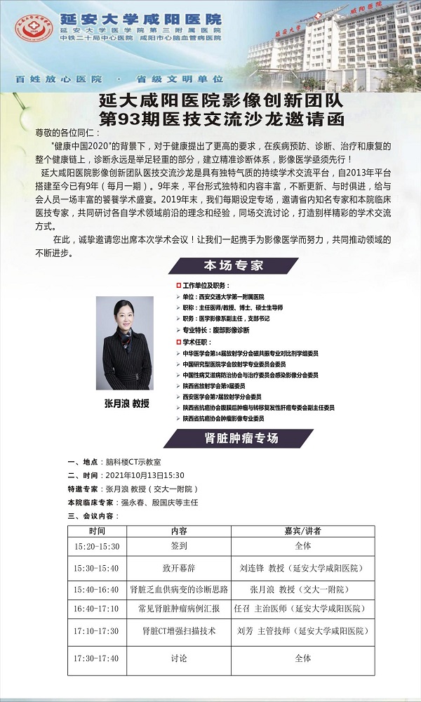 2021年10月13日,延安大學(xué)咸陽(yáng)醫(yī)院第93期醫(yī)技交流活動(dòng)在腦科樓CT/MRI示教室成功舉辦,會(huì)議由延安大學(xué)咸陽(yáng)醫(yī)院院長(zhǎng)助理兼醫(yī)學(xué)影像科主任劉連鋒教授主持,特邀西安交大一附院張?jiān)吕私淌谇皝?lái)授課指導(dǎo),我院泌尿外科強(qiáng)永春主任、腫瘤內(nèi)科殷國(guó)慶主任、劉玉龍醫(yī)師等臨床專家參加本次活動(dòng),我院影像及臨床醫(yī)、技、護(hù)共40余人參加了本次會(huì)議。