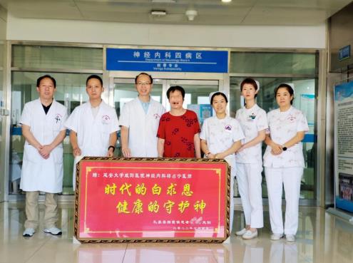 患者趙某,女,70歲,以頭昏、言語不利、口角流涎、雙下肢沉重?zé)o力、頭面部麻木不適為主,伴焦慮不安,發(fā)病后間斷口服藥物治療,癥狀緩解不明顯,曾先后多次在外院住院治療,效果不佳。聽聞我院為腦血管??漆t(yī)院,便前來診治?;颊叻磸?fù)發(fā)生急性腦梗死,合并2型糖尿病、甲狀腺功能減退癥,祁占寧醫(yī)生耐心詢問病史,根據(jù)其病情制定具體的治療方案,運用中西醫(yī)結(jié)合理論及方藥治療后癥狀明顯改善,并在住院期間對患者進(jìn)行心理疏導(dǎo),患者康復(fù)出院。出院后祁占寧醫(yī)生仍堅持做隨訪工作,及時了解患者情況,提醒按時服藥,定期做檢查。正是這位始終以“愛心、誠心、耐心、細(xì)心、責(zé)任心”為服務(wù)理念的醫(yī)生,打動了患者,這次他們不顧路途遙遠(yuǎn),專程將牌匾從家運送到醫(yī)院,就是為了表達(dá)對科室醫(yī)護(hù)人員的感謝之情!