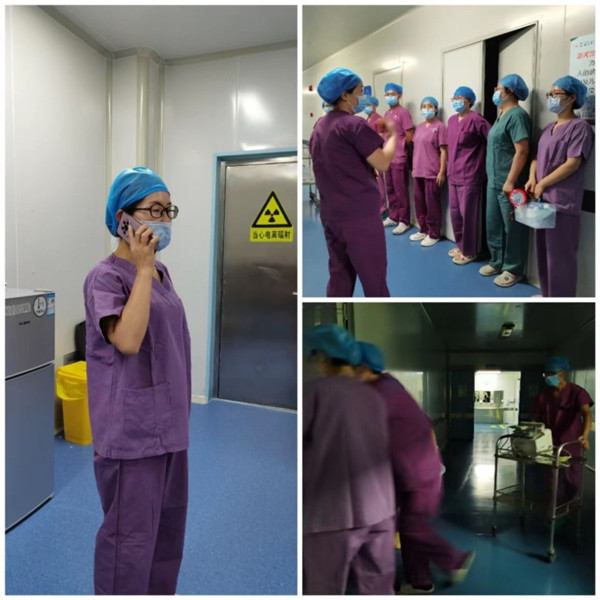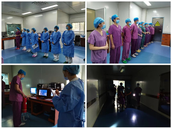 16:30在聽到一聲“著火了,著火了”演練正式拉開帷幕,在技師陳飛總指揮下各安全小組各盡其責。安全消防員周志偉護士立即關閉電腦電源,使用干粉滅火器對準火源根部進行滅火,陳飛通知辦公護士轉(zhuǎn)移等候區(qū)患者的同時關閉機房電源,侯新翠護士報告護士長,并撥通保衛(wèi)科電話請求支援,通知設備科和保障部關閉氧源和電閘。在陳飛的指揮下,治療護士晁艷艷及巡回護士魏繼云協(xié)助手術(shù)醫(yī)生張東升將正在手術(shù)的患者由東側(cè)安全通道撤離,將準備好的濕毛巾捂住患者的口鼻,盡可能以最低的姿勢或匍匐快速前進,侯新翠護士撤離搶救物品及儀器于安全區(qū)域,并協(xié)助維持秩序。辦公護士姚繼花將所有患者帶至安全地帶,安撫、穩(wěn)定患者情緒,并清點人數(shù)及儀器。