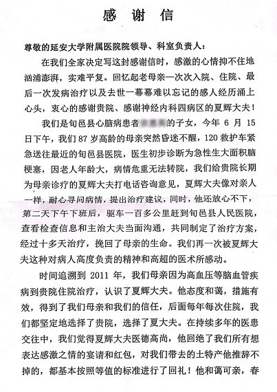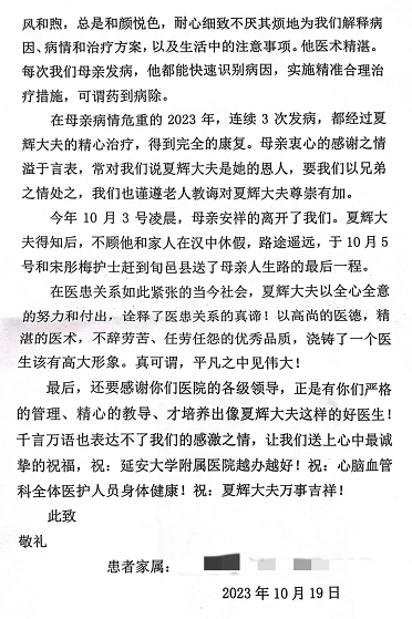 從2011年開始,患者因腦血管病在我院治療,在這十幾年中,每次身體不適或病情危重都是在夏輝醫(yī)生及宋彤玫護士精心的治療和護理下好轉(zhuǎn)出院。多年來患者一家與兩人建立了深厚的感情。10月3日患者因病去世,但是有感于神內(nèi)四病區(qū)醫(yī)護人員十年中對母親的悉心照料和精心診療,子女四人在處理完后事就帶著錦旗和感謝信來到醫(yī)院。家屬緊緊握著張桂芳主任的手,激動的說“衷心感謝你們這十幾年對我母親無微不至的照護,很幸運能遇到這樣一個優(yōu)秀的團隊,太感謝你們了,也祝愿你們醫(yī)院越辦越好......”滿滿的兩頁紙,承載了一段親如家人、溫暖和諧的醫(yī)患情,家屬用樸實的語言,表達了對我科醫(yī)護人員的感激之情!