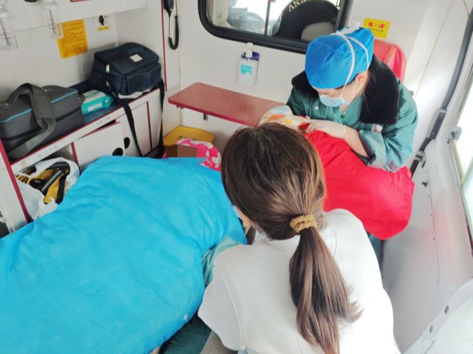 急救人員快速抵達(dá)現(xiàn)場(chǎng)后,醫(yī)生趕緊做進(jìn)一步檢查,發(fā)現(xiàn)胎頭已著冠,給予聽胎心后當(dāng)機(jī)立斷決定立即開始實(shí)施家中接生。大家鋪好一次性床單、擺好產(chǎn)包,常規(guī)消毒,急救護(hù)士遵醫(yī)囑建立靜脈通路,監(jiān)測(cè)孕婦生命體征,協(xié)助助產(chǎn)師跟醫(yī)生鋪無菌臺(tái)給予接生,醫(yī)生立即用手托住嬰兒的頭部,并指導(dǎo)產(chǎn)婦合理用力,采取保護(hù)會(huì)陰的措施,避免用力不當(dāng)導(dǎo)致軟產(chǎn)道裂傷,在大家的密切配合下,嬰兒于6:58分順利娩出,快速清理口鼻的羊水及分泌物,嫻熟地結(jié)扎臍帶。產(chǎn)科大夫剪斷臍帶,助產(chǎn)士及急救護(hù)士協(xié)助包扎固定斷端,其后順利將胎盤剝離,當(dāng)嬰兒清脆響亮的啼哭聲響起時(shí),在場(chǎng)所有人無不感到激動(dòng)和欣喜。喜悅之余,急救人員仍保持著高度的緊張和專注,不敢有一絲松懈。產(chǎn)婦神清語(yǔ)明,血壓、心率、脈率、血氧各項(xiàng)指標(biāo)良好。新生兒皮膚黏膜紅潤(rùn),啼哭聲嘹亮。確認(rèn)母嬰狀態(tài)良好后,立即做好產(chǎn)婦及新生兒保暖。轉(zhuǎn)運(yùn)途中,醫(yī)護(hù)密切關(guān)注產(chǎn)婦及新生兒生命體征、吸氧。同時(shí)電話通知開通綠色通道,并做好一切準(zhǔn)備。
