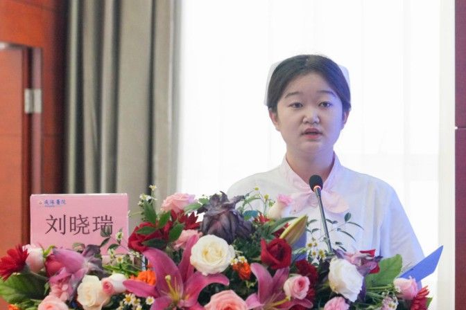 隨后,實習(xí)生代表劉曉瑞同學(xué)發(fā)言。她說:我們既是學(xué)習(xí)者,也是護(hù)理者,要時刻保持謙虛好學(xué)的態(tài)度,積極向上的心態(tài),強(qiáng)化理論知識,磨練專業(yè)技能,用專業(yè)的知識和飽滿的熱情,尊重患者、關(guān)愛患者,努力踐行“以病人為中心”的服務(wù)理念。