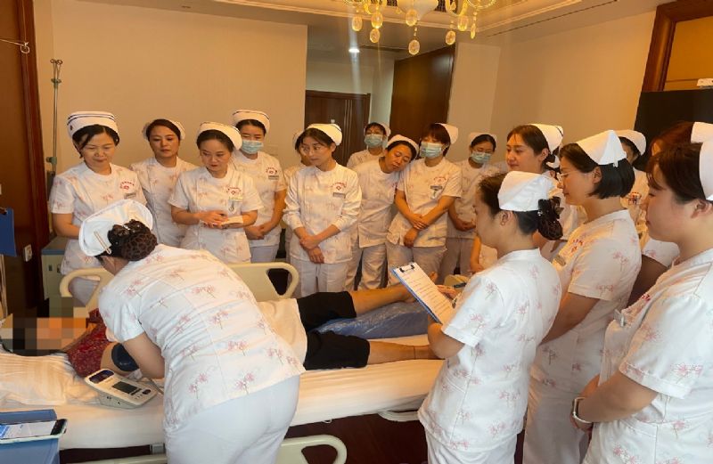 崔琳護士長根據(jù)2023年中華護理學會團體標準《住院患者靜脈血栓栓塞癥預防護理與管理專家共識》和《周圍血管血栓性疾病置管溶栓護理專家共識》對術(shù)前患者是否可以進行踝泵運動和下肢周長測量方法進行討論,并指導對患者術(shù)后下肢輕度水腫用硫酸鎂濕敷:1/4硫酸鎂粉劑+200ml水浸濕毛巾對患肢包裹,用保鮮膜包裹,每天3-5次,每次30min,補充了我們對此護理的不足。薛娜護士長從敘事的角度對護理宣教時機給予指導,并對茍美護士在護理過程中用敘事護理以患者為中心、尊重患者的故事、傾聽和理解等方面對患者的精心護理給予好評和肯定。在查房過程中,護理團隊針對患者的病情和護理也展開了熱烈的討論。大家各抒己見,提出了許多寶貴的建議和改進措施。例如,徐莉護士長提出及時指導臥床患者腹式呼吸,鍛煉患者心肺功能:殷本玲護士長指出對術(shù)后患者指導穿脫彈力襪、使用醫(yī)療彈力繃帶等問題給予指導。 黨文婷總護士長對本次查房進行了總結(jié)和點評,充分肯定了護理團隊的工作,并強調(diào)了護理工作中細節(jié)的重要性。護理過程中要重視患者的心理護理,表揚責任護士茍美的進步,表明把病人的需求作為中心點,有技巧的對患者進行宣教,健康宣教知曉率一定會有所提升,為患者提供更加全面、個性化的護理服務。