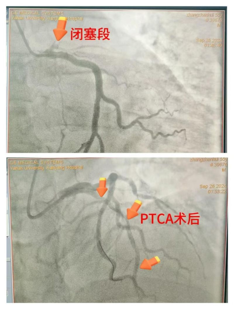 患者仍反復(fù)室顫,考慮與急性心肌梗死、急性胰腺炎導(dǎo)致的電風(fēng)暴相關(guān),唯一的希望是開通罪犯血管,但手術(shù)風(fēng)險極高。李新國科主任與患者家屬充分溝通病情,家屬理解并配合一切治療方案。立即開通胸痛綠色通道,啟動導(dǎo)管室行急診冠脈造影,術(shù)中證實為左前降支近段100%閉塞,緊急行PTCA開通罪犯血管,患者心律逐漸穩(wěn)定,血壓回升,意識好轉(zhuǎn),刺激有反應(yīng),返回CCU繼續(xù)治療。