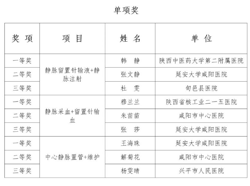 比賽結(jié)束后,陜西省護(hù)理學(xué)會(huì)靜脈治療專業(yè)委員會(huì)常務(wù)委員錢銳、委員陳靜、王娟娟分別對(duì)競(jìng)賽過(guò)程中選手們的表現(xiàn)進(jìn)行了點(diǎn)評(píng)。她們首先對(duì)各參賽者在比賽中展現(xiàn)出的精神面貌和專業(yè)態(tài)度給予了贊揚(yáng),肯定了選手們的專業(yè)能力。同時(shí)也指出各位選手在比賽中存在的不足并給出了中肯的建議。隨后,由咸陽(yáng)市護(hù)理學(xué)會(huì)副秘書(shū)長(zhǎng)何文靜宣布了比賽結(jié)果,本次競(jìng)賽評(píng)選出團(tuán)體一等獎(jiǎng)1個(gè)、二等獎(jiǎng)2個(gè)、三等獎(jiǎng)3個(gè),優(yōu)秀組織獎(jiǎng)6個(gè)以及個(gè)人單項(xiàng)獎(jiǎng)9個(gè)(獲獎(jiǎng)名單附后)。