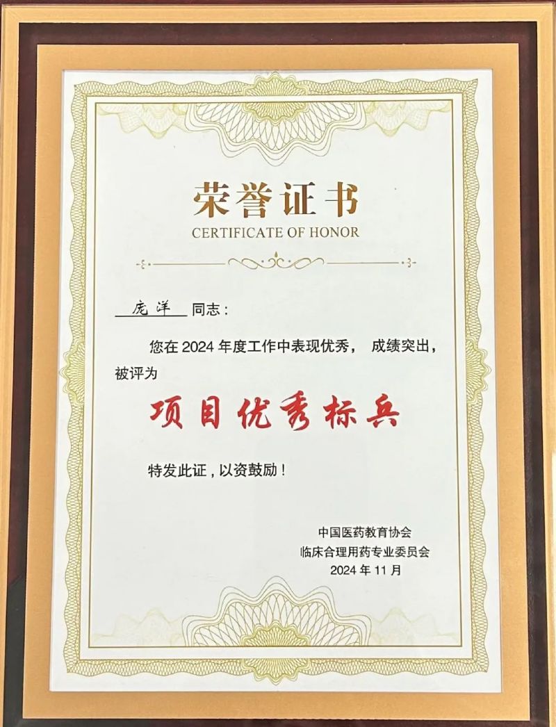2024年11月23日,第九屆中國(guó)醫(yī)藥教育大會(huì)暨中國(guó)臨床合理用藥大會(huì)在天津隆重召開,我院藥學(xué)部被中國(guó)醫(yī)藥教育協(xié)會(huì)臨床合理用藥專委會(huì)授予“先進(jìn)集體”,藥學(xué)部副主任龐洋代表醫(yī)院接受了表彰,其本人也被授予了“項(xiàng)目?jī)?yōu)秀標(biāo)兵”的榮譽(yù)稱號(hào)。